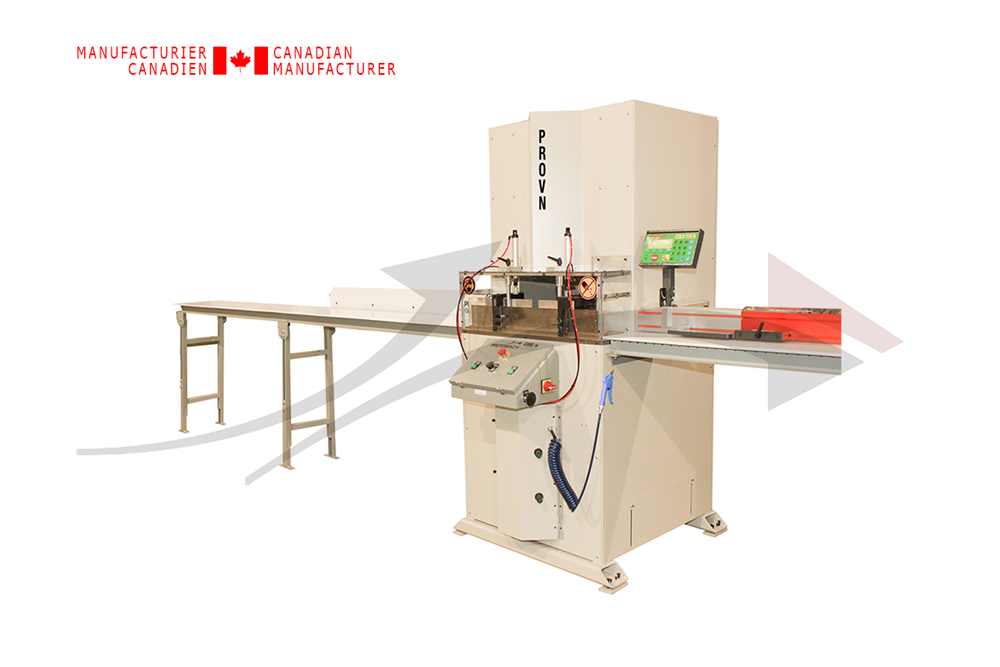 Vertical saw with 2 blade in V allowing to cut at 45 degrees the end of a piece at the same time than the beginning of the other. An affordable solution to cut your sash and frame.